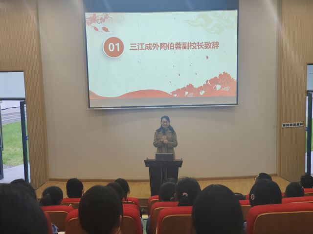 首先,三江成外副校长陶伯蓉致辞表示欢迎。陶伯蓉指出,希望同学们珍惜学习机会,领会此次交流会的精神,内化于心,外化于行,在以后的学习乃至人生道路上积极进取,勤于思考,向榜样学习。