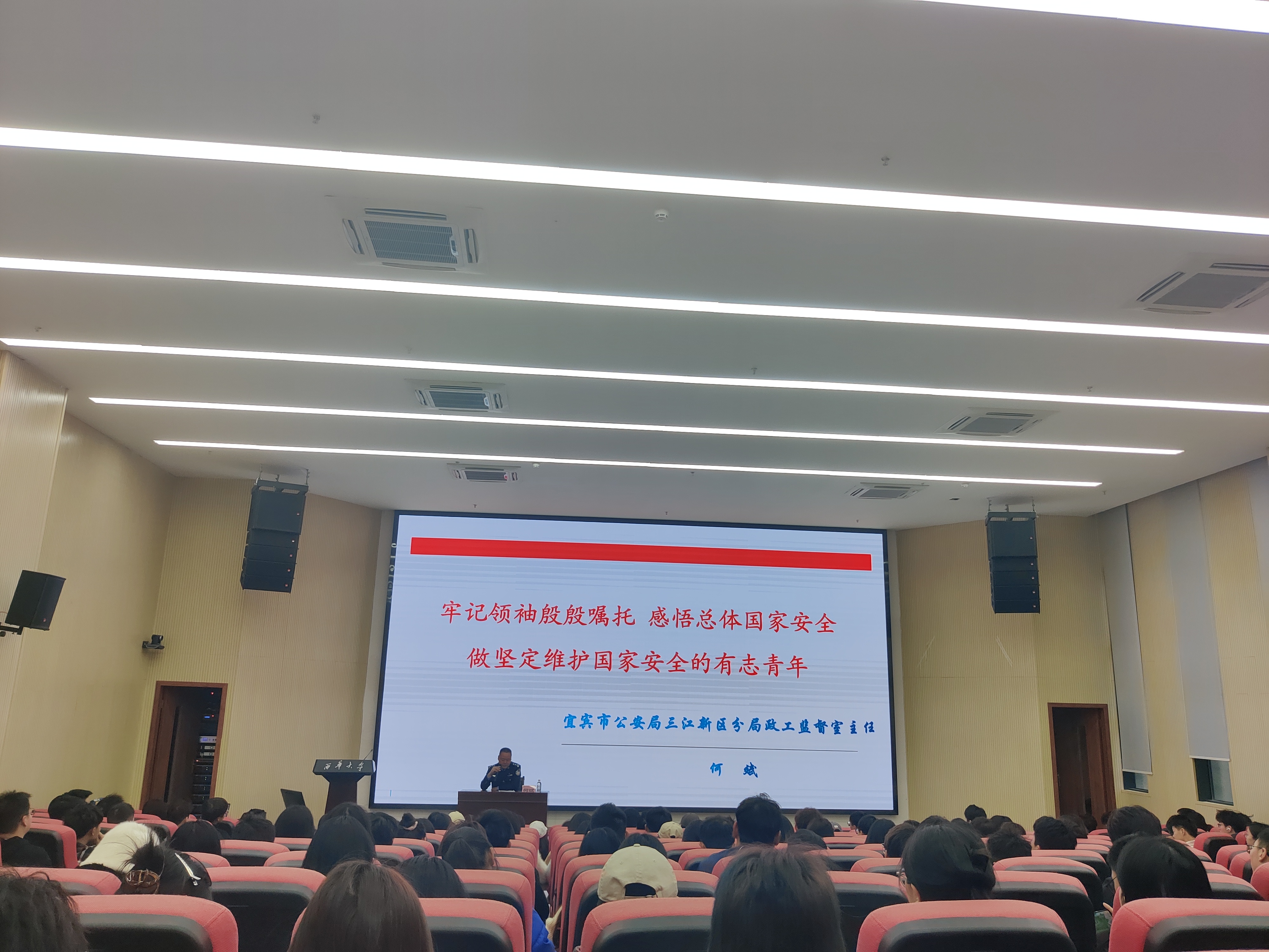 313日下午春季开学第一课在一教101报告厅正式开课。本次开学第一课邀请到了宜宾市三江新区公安分局政工监督室主任何斌主讲,围绕总体国家安全观为同学们带来了一场丰富生动的课堂。