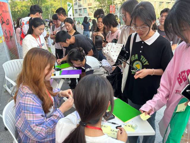 宣传活动现场,热闹非凡。吸引了大量同学参与,通过用毛笔写下五四精神经典语录、名言及其感悟的活动,激发广大学子的爱国情怀,感受先辈强大的精神力量,惜当今美好生活的来之不易,引导同学们以更加饱满的热情和坚定的信念为国家的发展贡献青春力量。