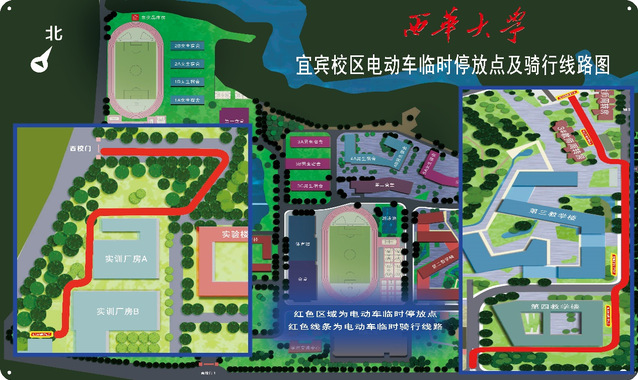 3. 在电动车停车点修建完成前,电动车只能通过西门和南2门出入校区,且要按临时规定路线骑行和指定位置停放。校内临时规定路线为:从西门至西门电动车临时停车点的道路,南2门至周转房电动车临时停车点的道路(见图示),其他道路禁止骑行。校内临时电动车停车点为:西门电动车临时停车点和周转房电动车临时停车点(见图示),其他区域禁止停放。不按规定骑行和停放的电动车,一经查实,将列入黑名单,不得进入校园。