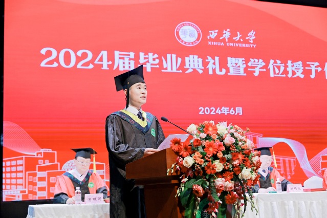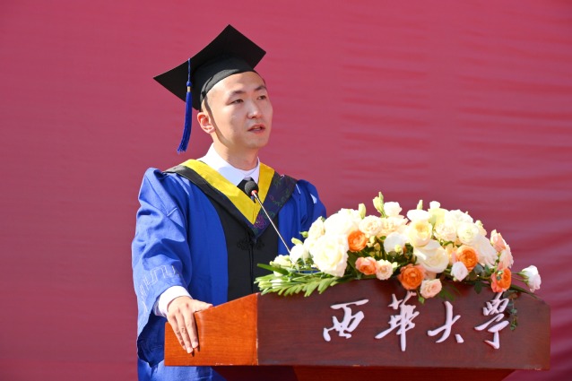 机械工程学院学生罗丕江作为本科生代表发言。他谈到,在西华学习的时光,学校教会了他努力向外看,学会向内求,坚定向前走。他号召全体毕业生,无论前往何方,身处何地,要牢记“求是、明德、卓越”的西华校训,牢记母校的殷切嘱托,带着西华人的责任担当,逐梦赴山海,扬帆再起航。
