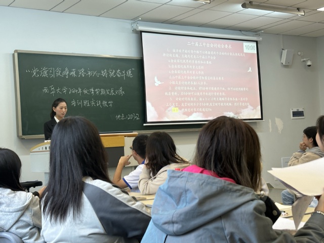 10月16日下午,入党积极分子培训班学员在一教报告厅进行了第一次实践教学活动。通过提问与深入讨论,重点学习了习近平新时代中国特色社会主义思想及党的二十届三中全会精神等核心内容。