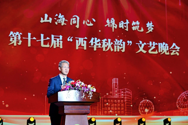 校党委书记刘树根代表学校向为学校发展付出心血的老领导、老同志和辛勤耕耘的全体教职工致以崇高的敬意,向海内外校友致以温馨的问候和美好的祝愿,向长期关心支持学校发展的社会各界朋友致以诚挚的感谢,向2024年新进教师和新同学表示热烈的欢迎。刘树根表示,“西华秋韵”文艺晚会是三全育人、以美育人的生动实践,是校区联动、鼓舞人心的文化盛典,更是畅叙情谊、共谋发展的朋友盛会。历经十七届的“西华秋韵”文艺晚会,不仅仅是一个简单的文艺活动平台,更是一个极具深度、饱含温度的校园美育载体,是美育成果得以集中展现的绚丽舞台。在这场晚会中,各地校友代表返回母校,与母校共叙情谊、与学弟学妹交流谈心,与朋友们共商共议,为学校发展建言献策。“西华秋韵”已经成为西华人共同的文化记忆,希望全体师生不断开拓创新、锐意进取,为谱写西华发展的新篇章不懈奋斗。