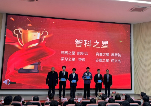 首先,表彰了四位“智科之星”,他们分别是:“竞赛之星”智能科学2022级2班姚朋见;“竞赛之星”智能科学2022级1班庞智航;“学习之星”智能科学2023级4班钟俊;“志愿之星”智能科学2022级3班何文杰,由陈广贵和杨志松为他们颁奖并合影留念。