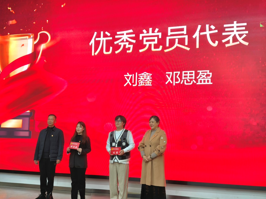 随后,表彰了优秀党员代表,他们分别是来自智能科学2021级6班的刘鑫和来自智能科学2022级4班邓思盈。杨万能和李欣为优秀党员代表颁奖。接着,刘鑫做了发言。他表示作为一名共产党员,必须对自身保持高标准、严要求,在学习和工作中发挥表率引领作用,面对挑战勇于担当,以实际行动带动周围人共同进步。高平茹老师和魏冬梅老师对表现突出的新发展党员颁奖并合影留念。