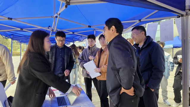 双选会现场,党委常委副校长费凌与招生与就业处、bv伟德国际体育官方网站党工委(管委会)主要负责人以及各学院党委副书记等共同走访企业招聘展位,认真了解企业的发展现状、招聘需求。费凌与现场应聘的同学亲切交谈,了解同学们的就业意愿和应聘情况,鼓励同学们充满信心,找准定位,有针对性地准备应聘简历,也预祝同学们找到满意的工作。