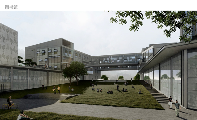谈到景观设计时,张教授强调“校园要有一种园林的气质”。校区所有的景观围绕保留的小山丘展开,小山丘作为校园的“绿心”,向围绕四周的庭院发散和渗透,形成“处处有景、开门见绿、步移景异”的山水画卷,院落也吸取了川南传统建筑特色和优点,尺度宜人,不仅有小气候调节功能,而且营造了一个无顶的公共活动空间,视线穿过校门前广场和图书馆巨型门洞,跨过大台阶“开门见山”,近观小山丘(绿心)观远观斗山,形成一条“通天达地”的景观中轴线,这条轴线是含蓄的,是潜移默化的“精神中轴线”。