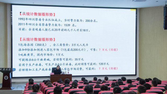 本次讲座由宜宾市叙州区公安分局禁毒大队教导员、国家二级心理咨询师钟桦主讲。她主要从毒品的定义和危害两个方面进行讲解。首先,钟桦向同学们阐述了《刑法》中毒品的定义、分类以及危害,并且向大家细致讲述了如何避免接触毒品等内容。她仔细讲解了目前新兴的毒品种类以及滋生吸毒行为的高危区域,并通过真实案例的分享告诫学生们:毒品其实近在身边,应随时提高警惕。随后,钟桦着重提到吸毒的本质其实是问题行为和错误思维意识下的一种随机选择性的从众行为。毒品预防教育才是让人们远离吸毒最有效的方法,它是培养求真思维能力与自我意识水平的特殊教育,每个人都应该做到守护生命安全和身心健康!最后,她强调树立正确思维,建立起能同毒品亚文化相抗衡的“禁毒文化”体系,培育有生命力的禁毒文化理念,打造“禁毒文化”为分支的“正文化”“正能量”,毒品问题的治理才有一线希望。