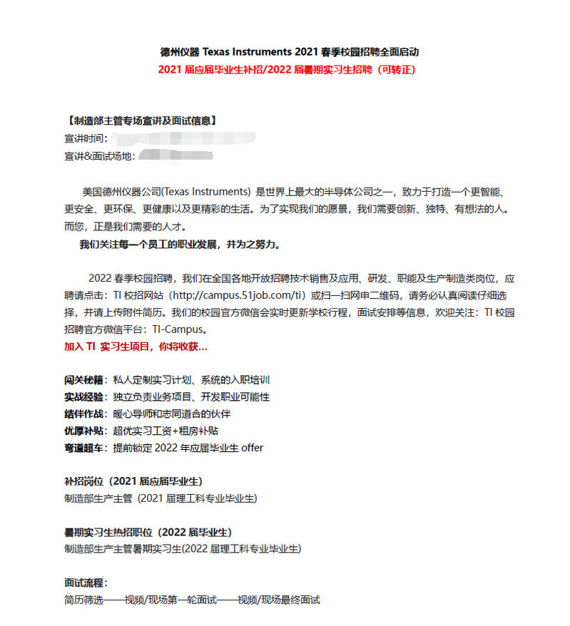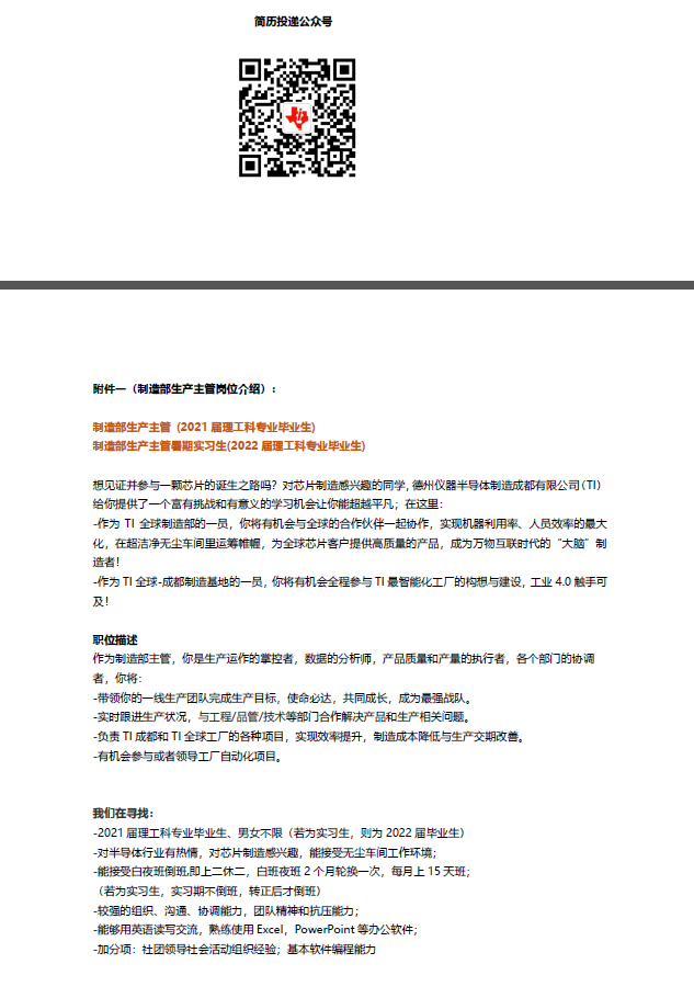 【线上招聘】德州仪器半导体制造(成都)有限公司