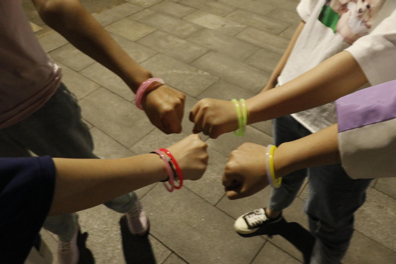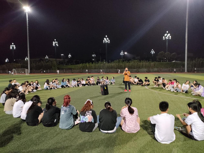 荧光夜跑结束后,工作人员组织同学们在足球场围成一个圈,举办草地音乐会。同学踊跃报名,其他同学也跟着合唱,现场气氛活跃,将整个活动推向了高潮。