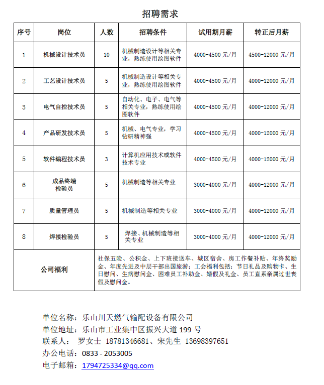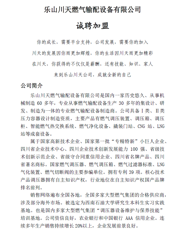 【线上招聘】乐山川天燃气输配设备有限公司