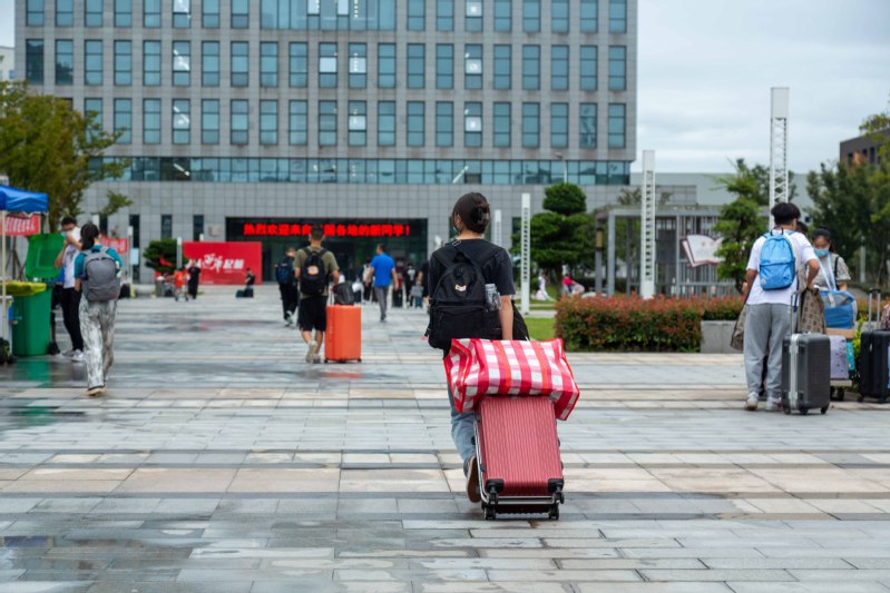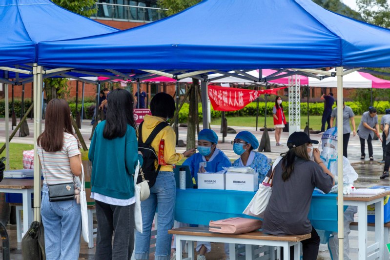 早上8:00,新生早早地到校门口有序排队,并在工作人员的引导下,依次出示核酸检测报告、防疫健康码、录取通知书等。省外同学则走省外专用通道进行现场核酸检测后进入校区。