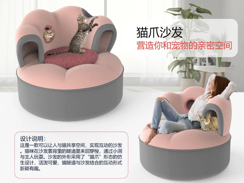刘婉婷同学专业知识技能丰富扎实,创意新颖独特,在张瀚文老师的指导下,将人与宠物互动的形式融入到日常家具中,设计了一款猫爪沙发,并将其转化为实际的产学研作品。