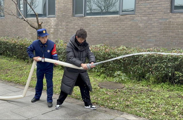 消火栓与灭火水带使用环节采用三人协同作业模式,从水带展开、接口对接,到阀门开启、对准火源出水,每个步骤都要求精准高效。针对实操中出现的“水带弯折”“接口未卡紧”等问题,教官当场指导整改,确保每组参训人员都能熟练掌握协同处置技巧。