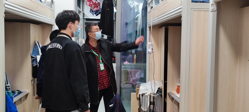 检查小组全程佩戴口罩,叮嘱同学要严格按照学校疫情防控工作通知要求,配合校区做好相关防疫工作,特殊时期,要做好个人防护,公共场合务必要佩戴好口罩,保持宿舍卫生清洁。