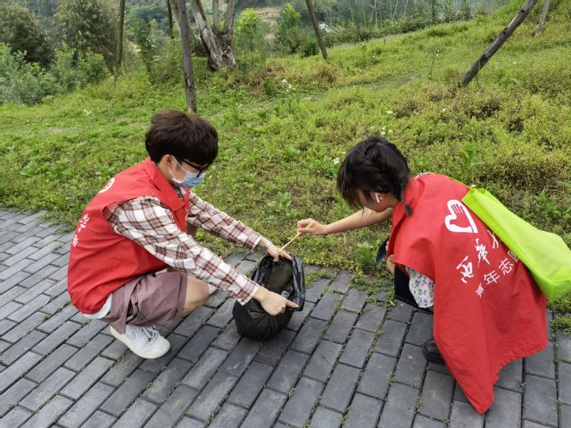 志愿者正在清除草丛垃圾
