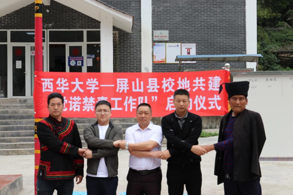 为彻落实四川省第七届大学生社团禁毒文化节活动相关工作要求,突出高校在社会服务中的重要作用,提升大学生禁毒意识和自我教育能力,引导大学生追求健康文明、积极向上的生活方式,实现校园文化与毒品预防教育相结合,共同打造一个绿色健康的校园环境,bv伟德国际体育官方网站于4月22日与屏山县校地共建“觉诺”禁毒工作队启动仪式在宜宾市屏边彝族乡隆重举行。宜宾市公安局禁毒支队二大队教导员翁玉龙、宜宾市江安县禁毒办专职副主任周显文、市公安局禁毒支队二大队副大队长刘强、屏山县公安局禁毒大队教导员张文相、屏山县屏边彝族乡党委委员黄维奎以及bv伟德国际体育官方网站bv伟德国际体育官方网站党工委陈太平出席此次启动仪式,“觉诺”禁毒工作队主要成员及当地居民参与本次启动仪式。