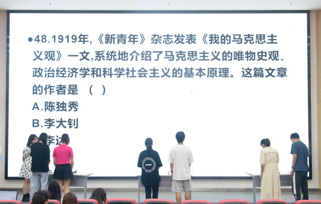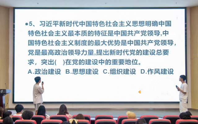 第二轮比赛采取抢答模式,每位选手可拥有一次场外求助机会。比赛开始,六位选手一边凝视屏幕上即将消失的数字,一边时刻准备按下抢答按钮。他们充分运用自己的党史知识和语言表达能力,沉着应战、积极答题、势如破竹,展现出扎实的基础知识和昂扬的精神状态。屏幕上一道道党史问题也让现场同学们重温了中国共产党建党以来的光辉历程,进一步学习了党的基本理论、基本路线、纲领等知识。