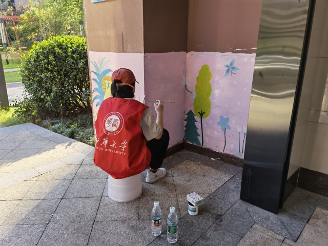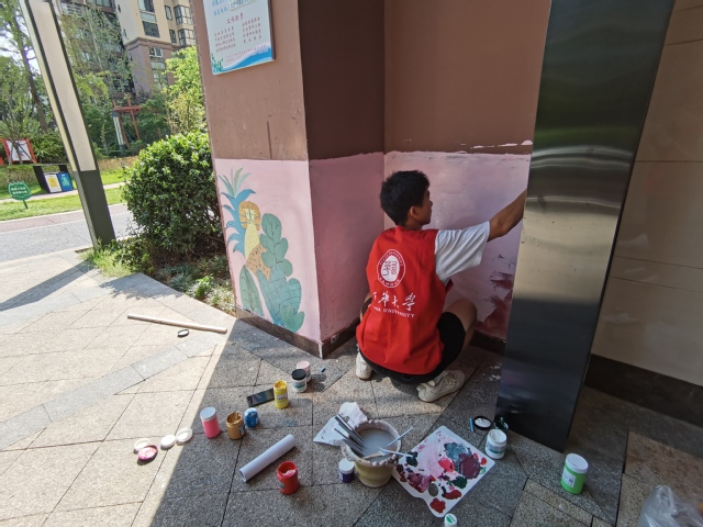 志愿者们于8月8日上午九点到达社区并立即开始考察周边环境,思考绘画思路,和小区负责人沟通交流过后,下午二点志愿者们开始着手对外墙绘画。粉色的小花,绿色的小树,开始生长在金色领地小区的墙上,一幅接着一幅,一片连着一片。活动结束后,小区里的小朋友纷纷跑来和墙上刚刚绽放的小花留下合影,志愿者看到这一幕后说道:希望自己的绘画能够给金色领地小区的小朋友留下金色的暑假回忆,能给小区的居民带来更多的幸福感。