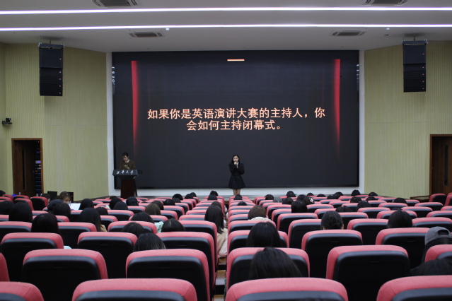 在精彩的开场舞表演活跃了现场气氛后,比赛正式开始。在第一轮美文朗诵环节,参赛选手们结合音频、视频、ppt等进行展示。经过激烈角逐,有11位选手顺利进入第二轮。即兴主持是非常考验选手们的语言能力以及应变能力的。选手们现场抽题,短暂思索后进行主持表演,有的现场模拟中秋晚会开场白,有的解说100米决赛现场,有的介绍运动会入场方阵。选手们反应灵敏,自信从容,现场不时传来鼓掌声。