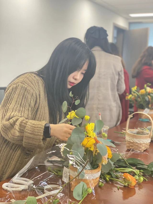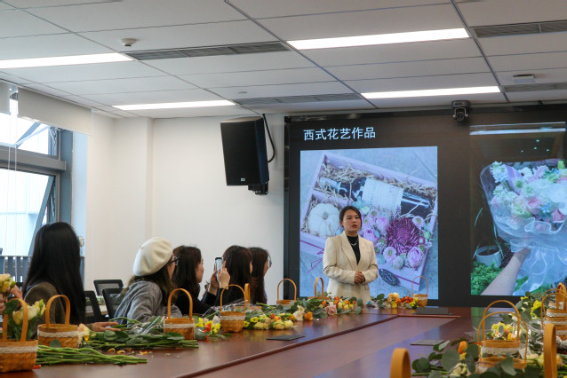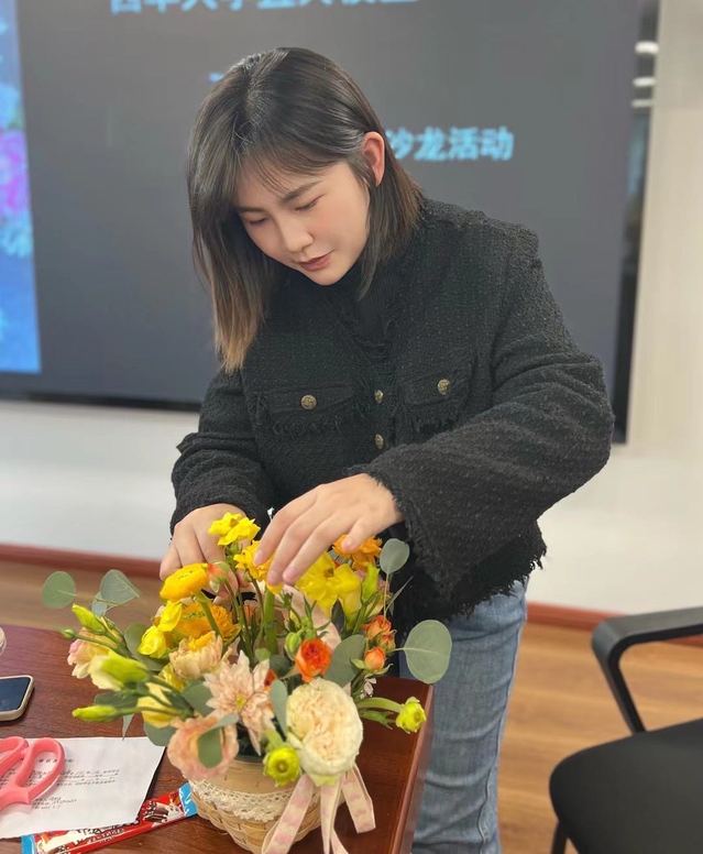 周芳从花艺沙龙、花艺风格、花种寓意、花类搭配、花与品牌五个方面引入插花艺术,向大家科普了花艺的相关背景知识。她结合个人的学习经历向大家讲解了何为中式插花与禅意插花的仪式感,并向大家展示了西方花艺在生活中的各种用途及其带来的积极效应。从理论到实践,周芳老师循序渐进,一步一插地向在座职工传授花篮样式、花材选取、枝叶修剪、色彩搭配等插花技巧和插花步骤,带领在座职工学习插花技术。插花过程中,每位女职工都兴致勃勃、认真构思、精心创作,慢慢地,一件件美丽、灵动的插花作品在大家手中悄然绽放,每位女职工的脸上都洋溢着欢乐,纷纷与自己的作品拍照留念。