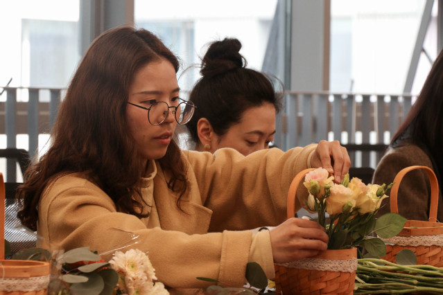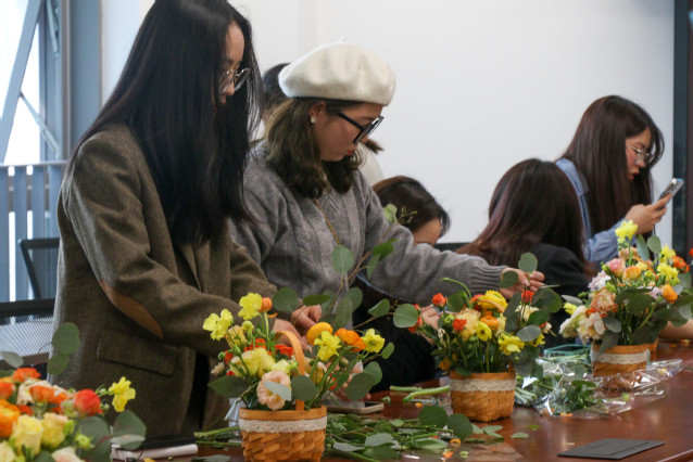 人间最美三月天,巾帼绽放别风采。为庆祝第113个国际妇女节的到来,向校区全体女职工献上诚挚的祝福,丰富校区职工的精神文化生活,bv伟德国际体育官方网站直属工会小组于3月8日在行政办公楼502会议室开展“三八”国际劳动妇女节插花艺术活动。本次插花艺术活动特邀花艺讲师——周芳作为主讲老师,20名女职工参与活动。