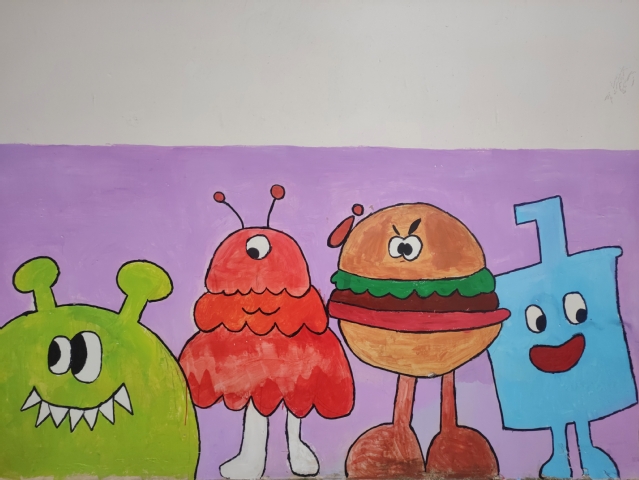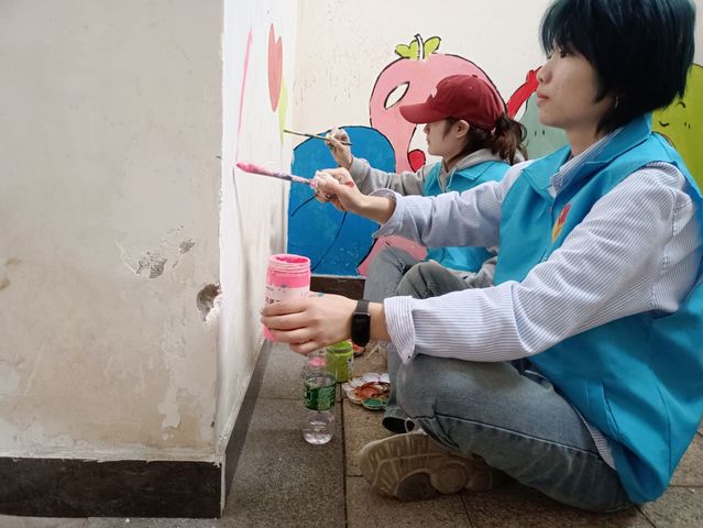 在这为期两天的修复活动中,志愿者们于早上九点在校区西门集合,一同前往构庄社区金色领地小区。18日上午,在与社区杨书记沟通修复事宜后,志愿者们开始对小区内四栋单元楼的墙面污垢及破损的地方,以“卡通涂鸦”、“海底世界”、“竹韵文化”、“社区文化”为四个主题展开墙体壁画修复工作。活动期间,社区内的小朋友们纷纷围上前来欣赏墙面,不少小朋友在与志愿者交流后,一起加入社区的绘画创作。在社区居民对绘画的赞美与肯定下,志愿者们体会到了奉献自己、服务他人带来的喜悦和自我价值实现的满足,也期盼着笔下的缤纷世界能给社区小朋友们创造一个美好舒适的成长环境,能为社区居民打造一块独特的文化阵地。