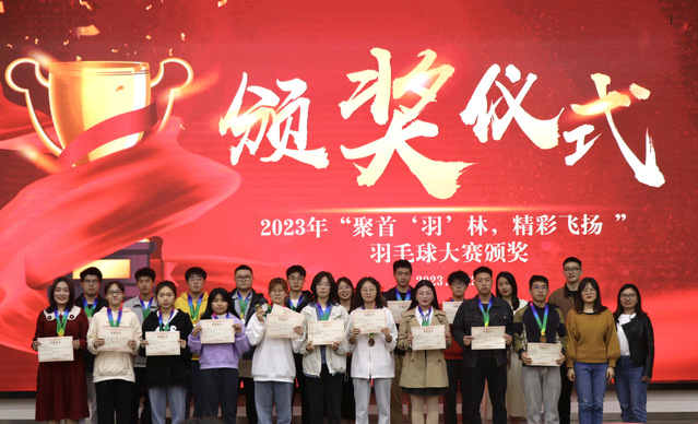 典礼开始,由主持人先后宣布个人奖项和团队奖项的获奖名单。随后吴依林、李芩旭、邓艳梅、孔祥芳、刁成豆五位老师分别为男子单打、女子单打、男子双打、女子双打、混合双打的冠亚季军进行颁奖并合影留念。获奖选手脸上洋溢着自信喜悦的笑容,观众也衷心地为他们鼓掌,赞他们的突出表现,更赞他们比赛过程中体现的体育精神。从初赛到决赛,所有参赛选手在赛场上你追我赶、不甘落后,展现出勇攀高峰的奋斗精神,书写着青春的力量,为观众呈现了一场场激烈精彩的比赛。