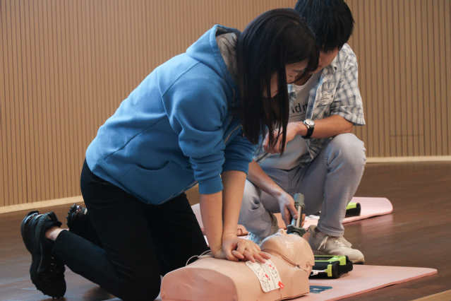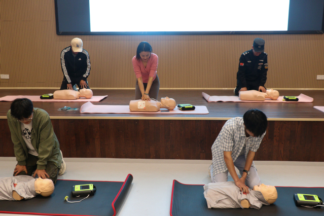 操作训练阶段。共分八组练习,现场配备演示橡皮人和AED设备,大家积极踊跃地实际操作AED设备和实施心肺复苏,指导老师现场讲解操作要领和技巧,指导大家实操训练,对错误的操作耐心纠正。