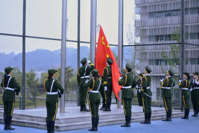 早7:00晨光熹微、气候清爽,由国防特勤中队16名国旗护卫手组成的队伍整齐划一迈着矫健有力的步伐,沿着跑道向国旗台行进,天蓝色的跑道映衬着松枝绿色的军装,更加凸显出旗手们的英姿飒爽、器宇轩昂。伴随着浑厚、庄严的国歌,护旗手有力地挥出手中的国旗,五星红旗冉冉升起,在空中燃起鲜艳的中国红,全体师生肃立,齐唱国歌,行注目礼。